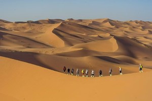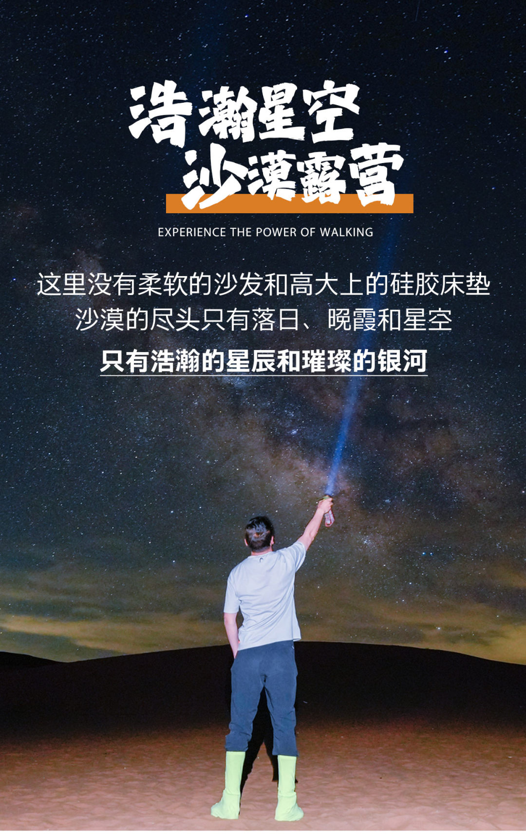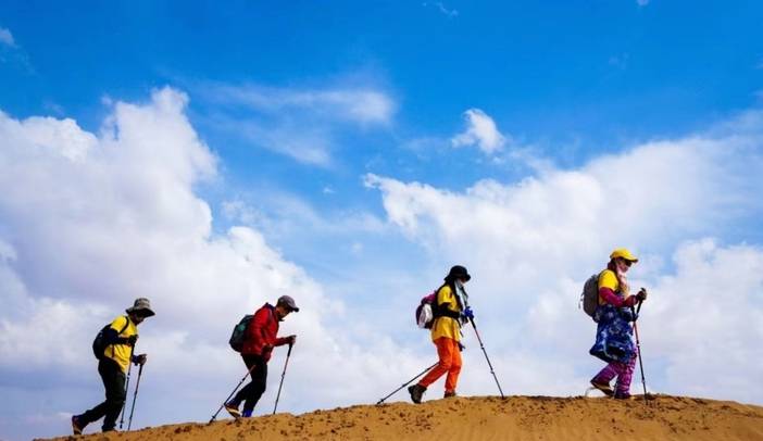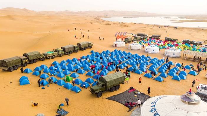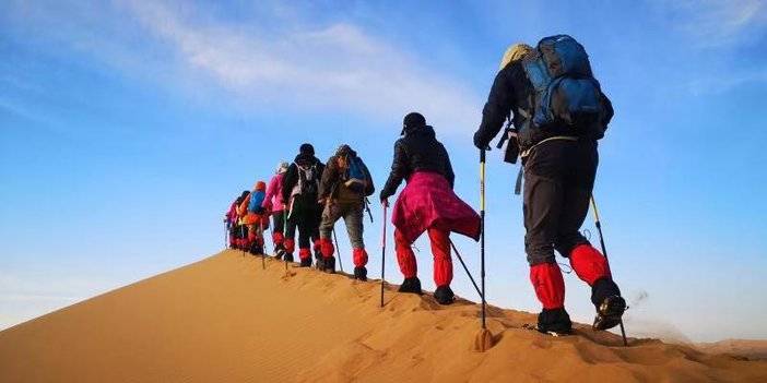 午餐之后,预计13:30左右抵达徒步起点,分发沙套、魔术头巾、登山杖等物资,之后跟随领队在沙漠徒步起点处开始做热身运动,今日徒步全天行程15公里,匀速5-6小时即可到达营地,夜宿小天鹅湖营地。