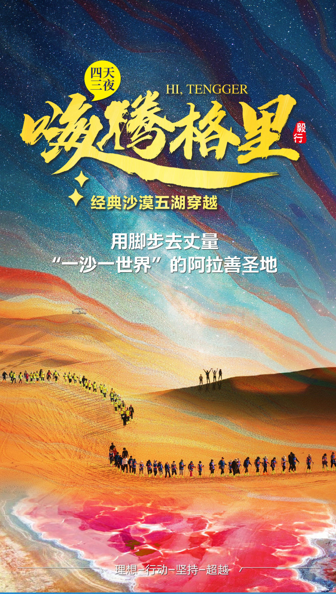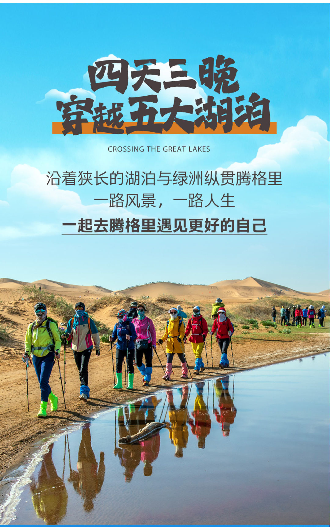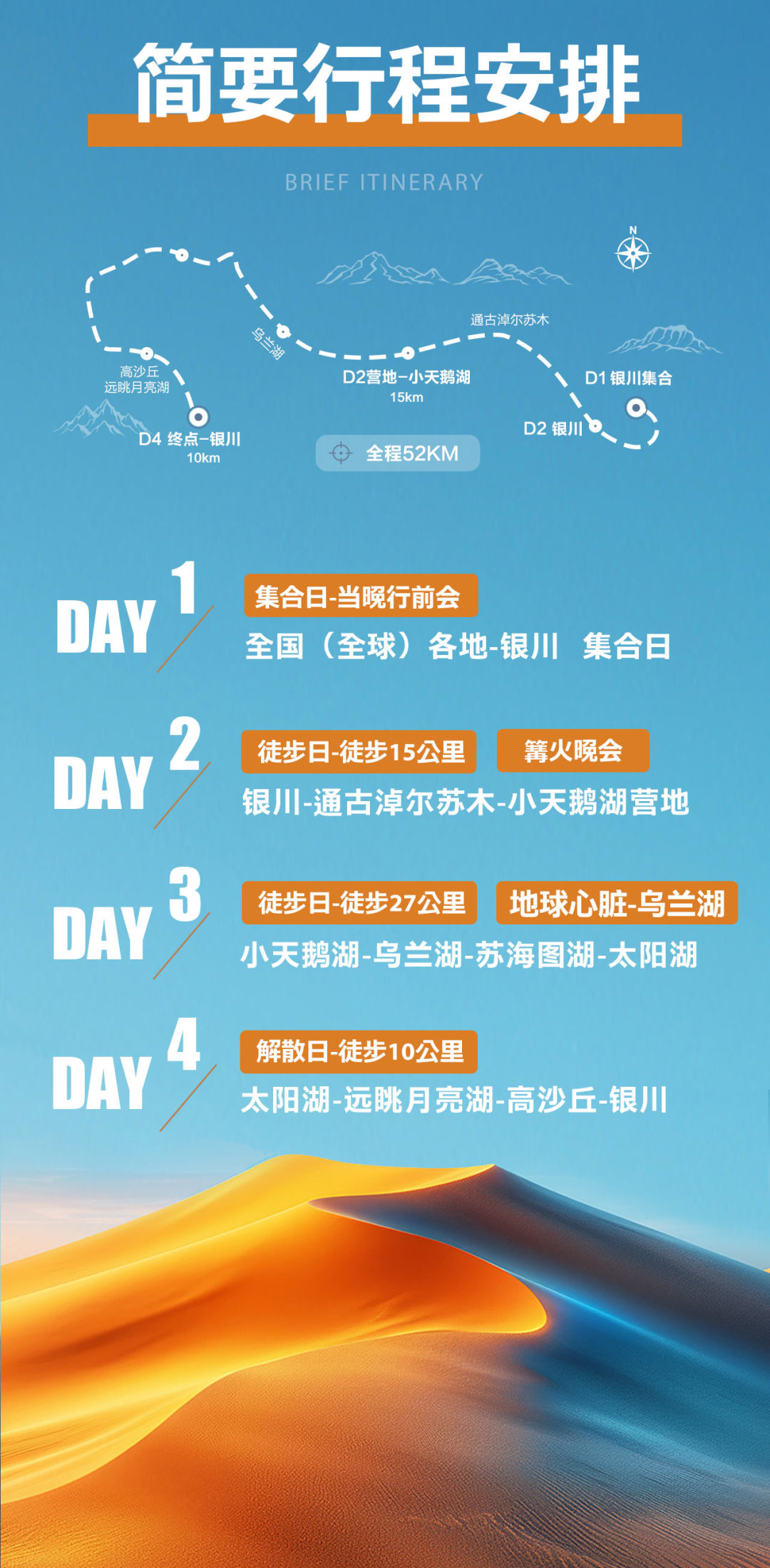 今日沿途可远眺月亮湖(不进入湖内),碧绿湖水、漫漫黄沙、蔚蓝天空在这里交织成一个美妙的画卷,继续行走10公里到达终点! 领队在终点为大家颁发奖牌,集沙瓶,合影留念;午餐过后,大家一起返回银川解散。