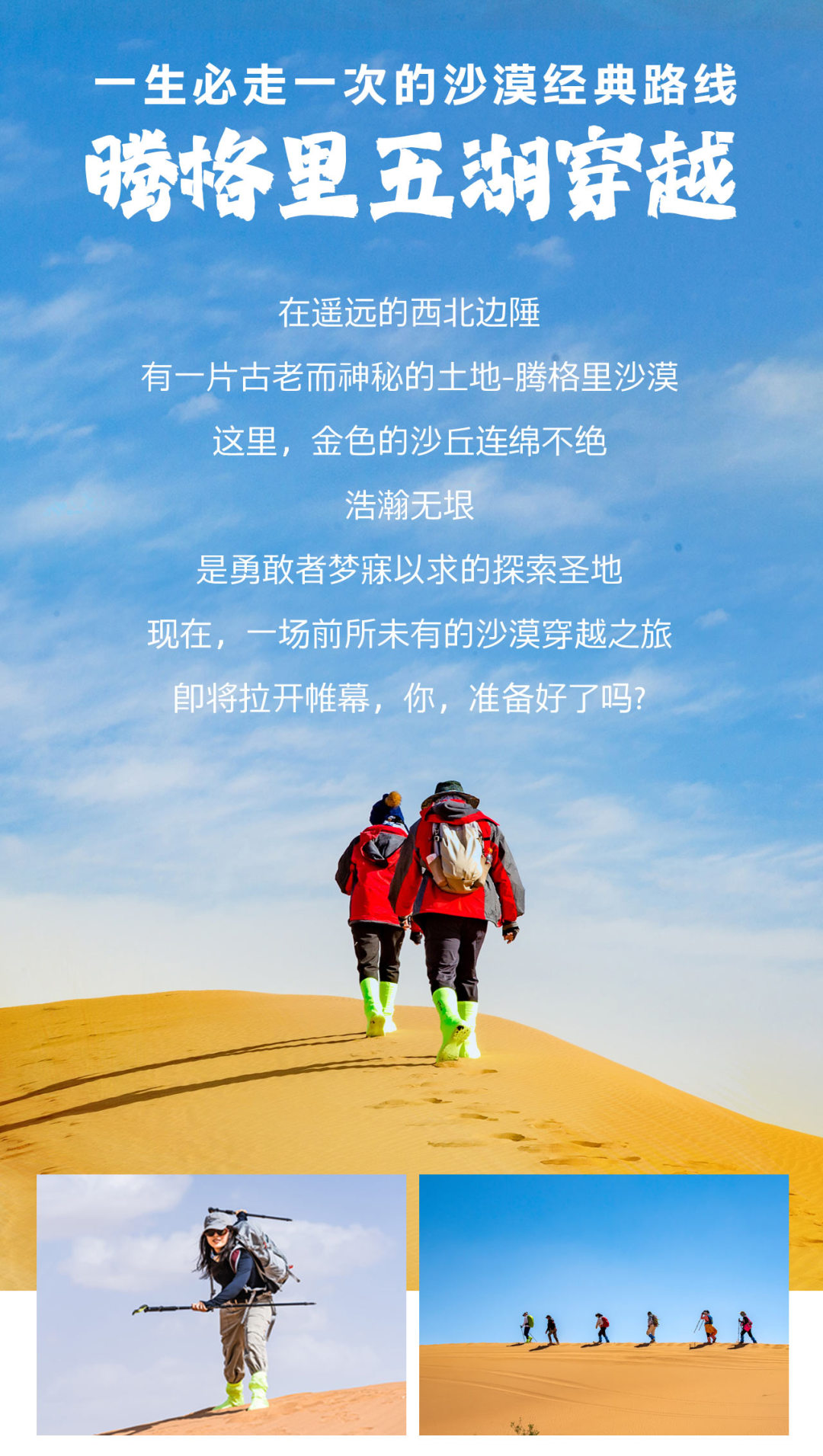 1) 领队:全程专业级沙漠徒步领队服务,均为资深领队,根据人数配置