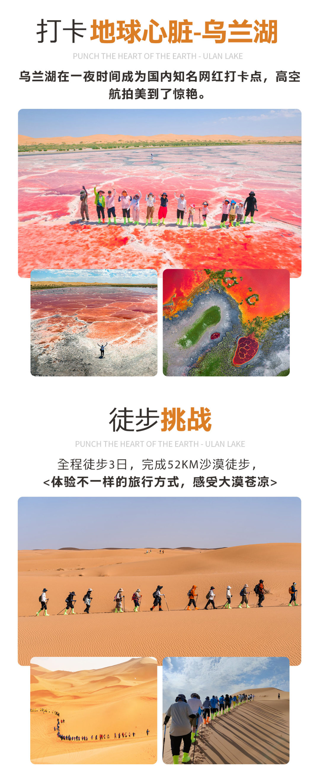 今日途径2024年度西北地区最火爆网红打卡点【地球心脏-乌兰湖】,在腾格里沙漠深处的无人之境,有一颗鲜红的,正在跳动的“地球之心”,这里没有人烟,也没有信号,这是一片炙热的红色湖泊,在地球上沸腾,就像是地球跳动的脉搏。你在地图上也找不到它的位置,所以请记住它的名字—乌兰湖。走在湖边,就像行走在一盘巨大的粉色调色板上,如果不亲眼所见,你绝对不会相信这些现切的雪花牛肉和灌满石榴汁的湖泊是真实存在的。